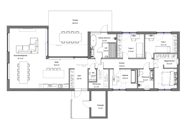 Esimeses tiivas paikneb avatud planeeringuga elutuba ja köök, mis moodustavad maja sotsiaalse keskme.