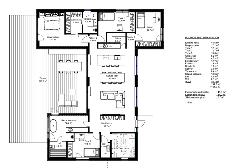Majatüüp SS9 on läbimõeldud ja modernne elamu netopinnaga 154,6 m². Planeering on jaotatud kaheks selgelt eristuvaks funktsionaalseks plokiks, mis tagab mugava ja loogilise ruumikasutuse nii igapäevaeluks kui ka lõõgastumiseks.